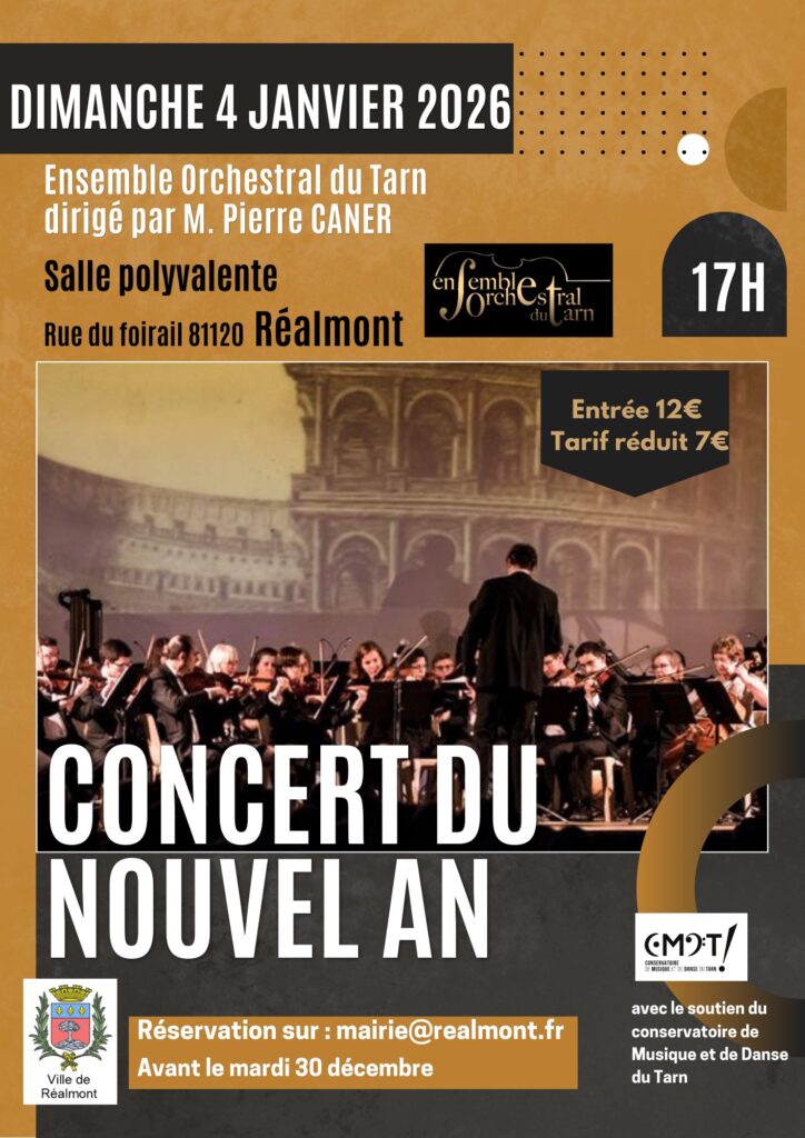 “Le dimanche 4 janvier à 17h, l’Ensemble Orchestral du Tarn dirigé par Pierre Caner interprètera le concert du nouvel an à Réalmont. Venez commencer l’année en musique !“