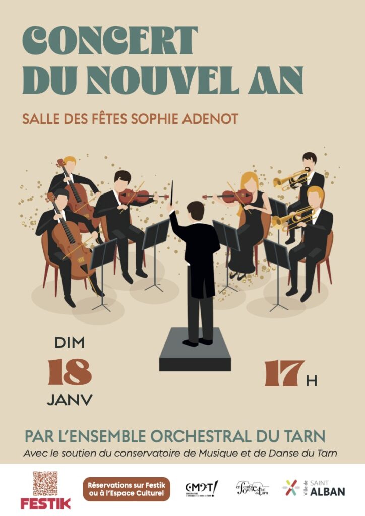 “La Ville de Saint-Alban est fière de vous inviter à débuter l’année en beauté avec un concert exceptionnel de l’Ensemble Orchestral du Tarn. Laissez-vous envoûter par la magie de la musique dans une ambiance conviviale pour bien commencer l’année.“